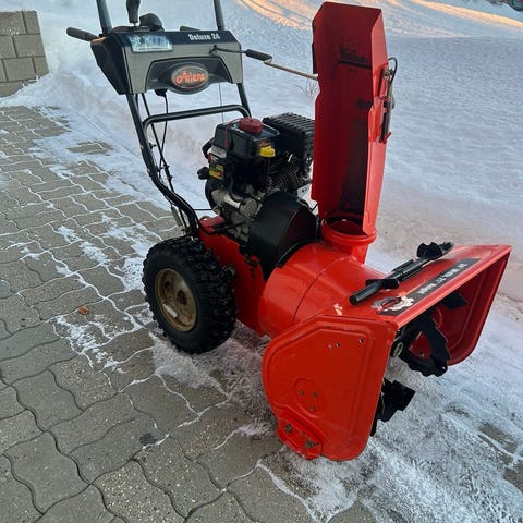 7hk liten og snedig snøfreser som gjør jobben bra. Den har fått ny olje, renset forgasser og reimer er bra. Byttet olje på kryss giret fremme å smørt opp bevegelige deler🙂