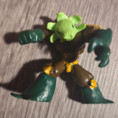 Kjennetegn: Figuren er blå med mørkeblått bryst og oransje detaljer på hodet og lemmene. Hun er designet med et skilpaddelignende utseende.