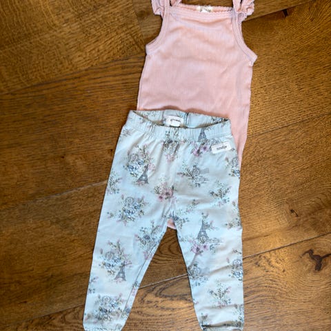 Søtt H&M sett for jente i størrelse 68. Settet består av blå leggings i bomull med mønster, hvit ermeløs topp med broderidetaljer samt matchende blå hårbånd.