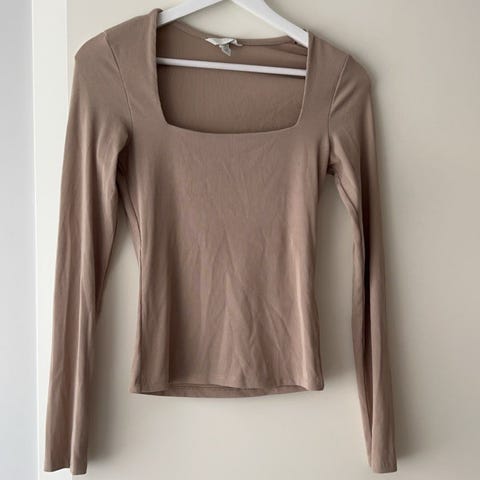 Nelly Filly Rib Top genser for dame i størrelse M. Genseren er beige og har lange ermer og dyp, rund utringning. Materialet er hovedsakelig polyester med innslag av viskose og elastan, som gir et mykt og lett stretchy stoff. Passer godt til hverdagsbruk alene eller under andre plagg.