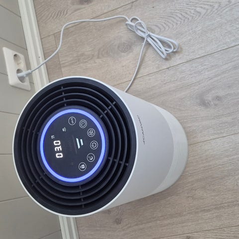 Sensibo luftrenser i fargen hvit. Enheten har perforert front for luftinntak og en vertikal LED-lysstripe i front. På toppen/oversiden finnes betjeningspanel med flere knapper og indikatorlamper for innstillinger. Luftrenseren er egnet for innendørs bruk og kobles til strøm via ledning. Passer til bruk i oppholdsrom som stue, soverom eller hjemmekontor der man ønsker filtrering av inneluft.
