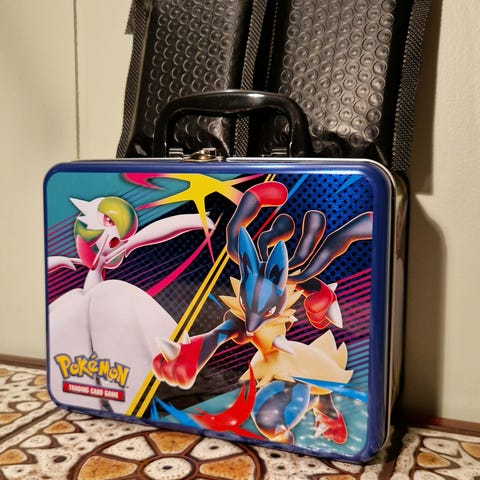 Metallboksen har motiv av ulike Pokémon-figurer på begge sider og håndtak på toppen. Den er egnet til oppbevaring og transport av Pokémon-kort. Bildene viser et utvalg Pokémon-kort som følger med boksen, inkludert både vanlige kort og holografiske kort. Antall kort og nøyaktige serier/utgaver fremgår av bildene.