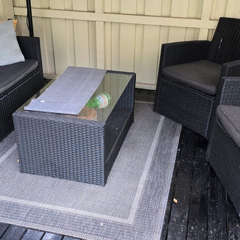Justerbare hagemøbler fra Taigaen, to lenestoler en sofa med tre seter hvor alle ryggene kan justeres. Alle setene har trinnløs justering i rygg for best komfort. Et stort spisebord med glassplate. Hele gruppen er håndflettet i rund/ dobbel halvrund kunstrotting i grå farge med grå puter for et moderne utseende. Nyt vakre sommerdager, både hjemme og på hytta. Allerede i påsken kan være muligheter 🐣😉 Putene er dessverre falmet i sola på den ene siden, men putene er like fine på den reverserte siden og er ikke vært eksponert for sol. Alt er i topp stand ellers. Ingen skader eller tekniske feil. Møblene har siden ny i 2022 stått på en innglasset terasse, så aldri vært utsatt for regn og snø.