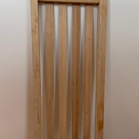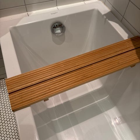 Bambus badekarbrett i naturfarge, et snaut år bare. Brettet er justerbart i bredden og kan tilpasses ulike badekar. (76-108 cm.)