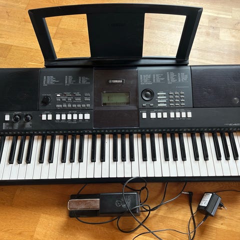 Yamaha keyboard elektrisk piano med innebygde høyttalere og display. Instrumentet har fullstendig klaviatur i standard størrelse, ulike funksjonsknapper for lyder, rytmer og innstillinger, samt tilkoblingsmuligheter på baksiden. Egner seg til øving hjemme, undervisning eller hobbybruk for både nybegynnere og mer erfarne brukere.