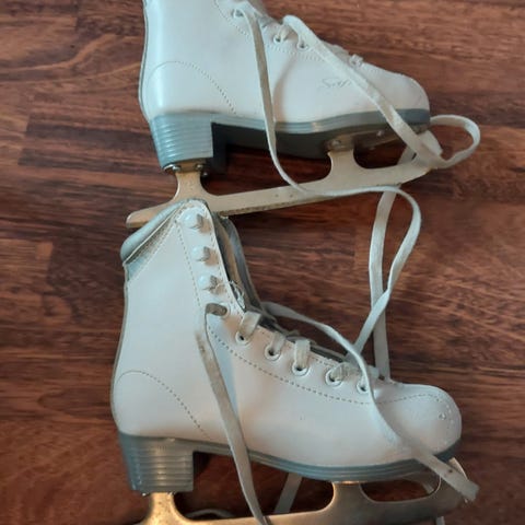 Klassisk hvit modell med snøring og fastmontert skøytestål. Egnet til generell skøytebruk og lek på is for barn. Pent brukt.