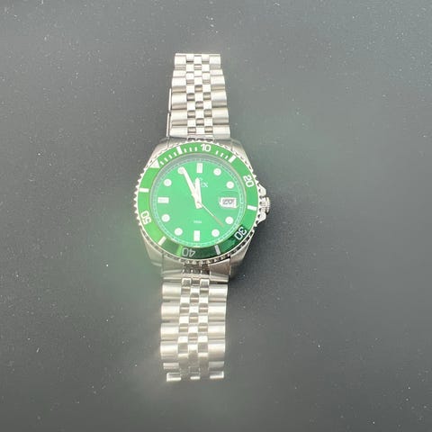 Inex herreklokke med grønn urskive og stållenke. Klokken har rund kasse med dreibar bezel og tydelige timemarkeringer. Datovindu ved klokken tre. Lenken er i rustfritt stål med foldespenne. Analog visning med tre visere. Egnet som hverdagsklokke for herre.