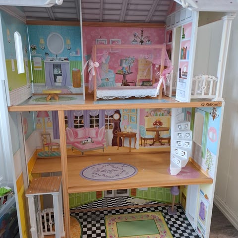 Stort fleretasjes vintage dukkehus med lys i. Huset har flere etasjer og rom, blant annet soverom, stue, kjøkken og entré. Innvendig er det trykte detaljer på vegger og gulv som viser møbler, gardiner, tepper og dekorasjoner. Det er balkonger. Nydelige detajler i fine pastellfarger!!