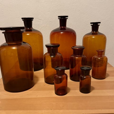Settekasse figurer / småflasker til settekasse / vintage i miniatyrflasker / brune flasker / miniatyrer i glass / vintage miniatyrer / farvet glassflasker / settekasse / miniatyrgjenstander / mini laboratorie kolbe flaske / Apotekerflasker / målekolbe i glass