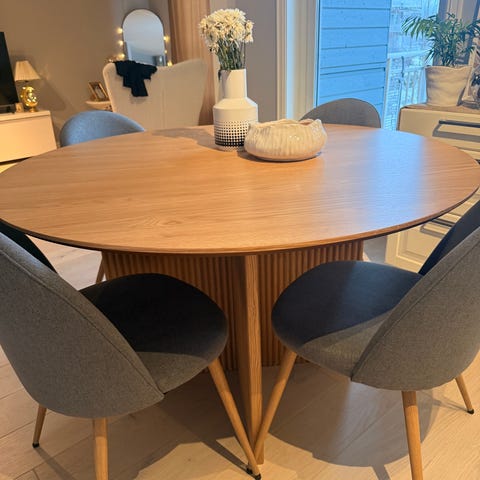 Spisestoler kjøpt brukt for ett år siden, hadde vært brukt i en utleie enhet derfor i god stand. Brukte de selv i bare noen måneder da jeg kjøpte andre stoler.