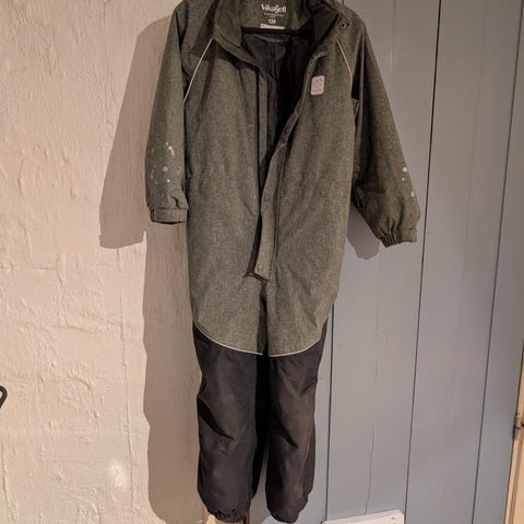Vikafjell parkdress for barn i størrelse 128. Dressen er unisex og kommer i brun farge. Yttermaterialet er i polyester. Parkdressen har hette, lange ermer og lange ben, samt refleksdetaljer for bedre synlighet. Frontåpning med glidelås og knappestolpe. Egnet som yttertøy for barn i vått og kjølig vær.