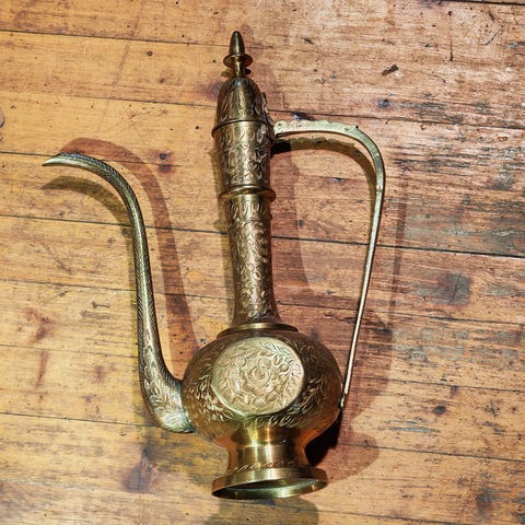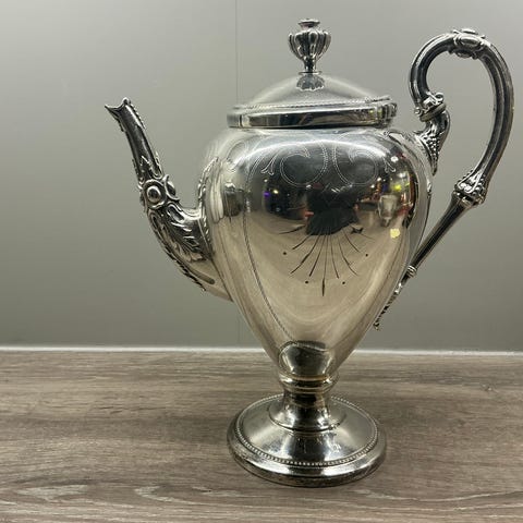 Dette er et solid og dekorativt stykke, trolig brukt til kaffe eller varmt vann. Tydelige og ærlige bruksspor som vitner om alder – ikke pusset, patina bevart.