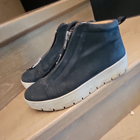 Nude of Scandinavia sneakers/joggesko i størrelse 38. Modellen har overdel i svart materiale med glidelås foran og kileformet såle. Yttersålen er i gummi med godt mønster for grep. Passer til hverdagsbruk og lett fritidsbruk.
