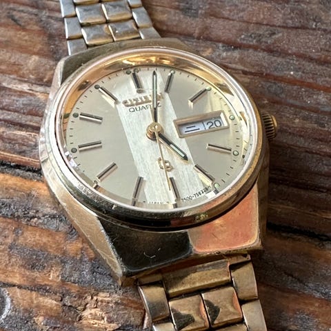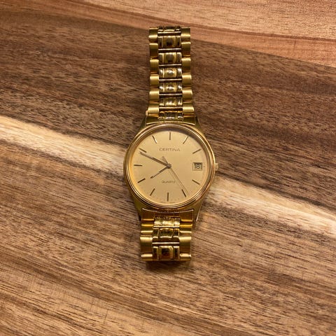 Citizen Quartz dameklokke i gullfarge. Klokken har rund urkasse med lys gullfarget skive, enkle strekindekser og tre visere. Urverket er quartz (batteridrevet). Lenken er gullfarget med ledd i mønstret design og foldespenne. Passer som hverdagsklokke eller til penere anledninger for dame.