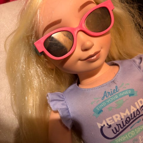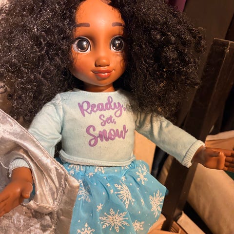Disney dukke med langt brunt hår og store grønne øyne. Dukken har på seg rød topp, denimshorts, jakke og røde sko. Egnet som leke for barn eller som samleobjekt for Disney-figurer.