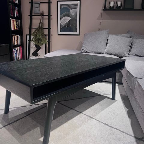 Rektangulært sofabord i sortbeiset eik. Bordet har rette linjer og skråstilte ben. Under bordplaten er det en åpen hylle som kan brukes til oppbevaring av for eksempel fjernkontroller, blader etc. Ingen synlige bruksmerker eller slitasje.