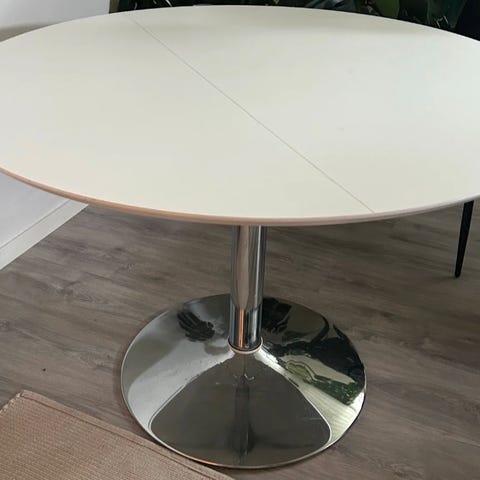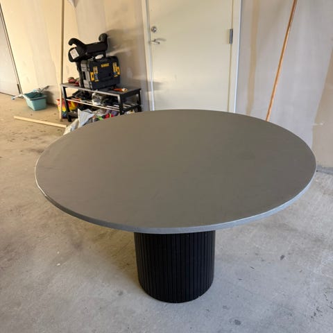 Flott bord i heltre med utleggsplater. Bordet er 110 cm i diameter og ileggsplater er 55 cm. Bordet er lite brukt og malt over med en matt svart maling.