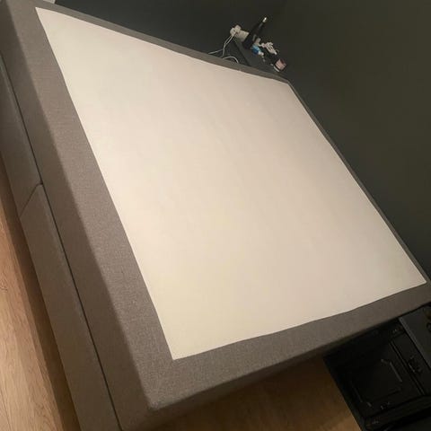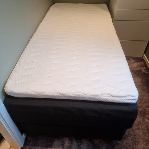Svane kontinentalseng med overmadrass i størrelse 150x200 cm. Sengen har en grå tekstiltrukket underdel og en hvit overmadrass. Kontinentalsengen gir en hel liggeflate uten skjøt og passer til soverom der det er behov for en dobbeltseng i standard bredde. Overmadrassen kan tas av for lufting og rengjøring etter behov.