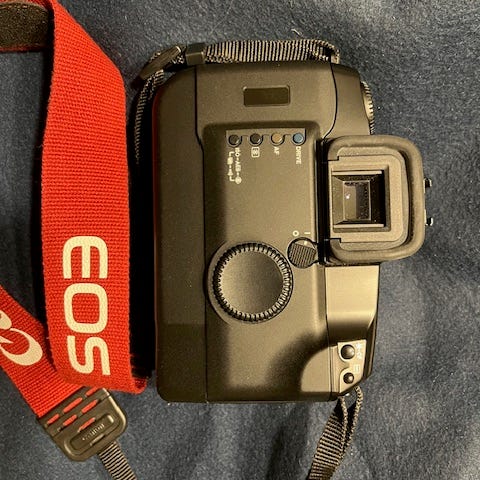 Canon EOS 5 analogt speilreflekskamera i svart. Kamerahuset er et 35 mm filmkamera i EOS-serien, med utskiftbar optikk via Canon EF-fatning. Øverst finnes programhjul for ulike opptaksmodi og innebygd LCD-skjerm for visning av innstillinger. Kamerahuset har innebygd søker og betjeningshjul på baksiden. Bildene viser også et eksternt Canon-batteripakke-/strømadapter med spiral kabel samt et batteri, som kan brukes som strømforsyning til kameraet. Passer for brukere som ønsker et klassisk analogt speilreflekskamera med EF-objektiver.