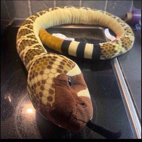 Wild Republic kosedyr formet som en slange. Mykt stoff i grønn- og bruntoner med mønster som etterligner slangeskinn. Lang og fleksibel kropp som gjør at den kan legges og formes på ulike måter. Egnet som kosedyr eller dekorasjon på barnerom og lignende.