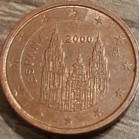 Spansk 1 eurocent-mynt fra 2003. Myntens design viser den imponerende fasaden til Katedralen i Santiago de Compostela, som er et verdenskjent pilegrimsmål.