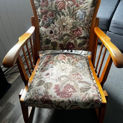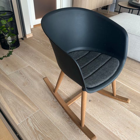 Jeg ønsker meg en gyngestol i tre, som denne. Krogenæs eller tilsvarende, med ullstoff. Trenger ikke være samme farge.