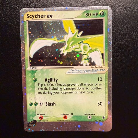 Pokémon Scyther samlekort. Kortet viser Pokémon-figuren Scyther med angrep og verdier som på bildet. Standard Pokémon-bakside. Egnet for samling eller som del av et Pokémon-kortspillsett.