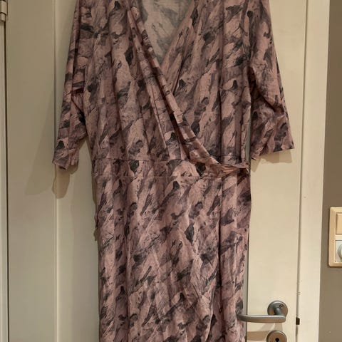 Noa Noa hverdagskjole i jersey for dame i størrelse L. Kjolen er rosa med mønster og har omslagseffekt i front. Mykt jerseymateriale gir behagelig passform, og lengden går omtrent til kneet avhengig av høyde. Egnet som hverdagskjole eller til enkle anledninger.