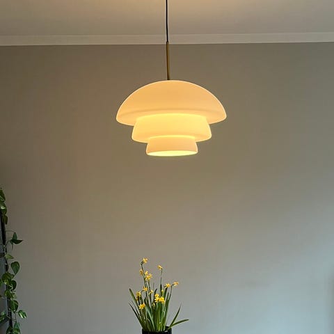 Lampen er kjøpt som B-vare i 2024, med en mindre produksjonsfeil/ufullkommenhet. Vi har aldri klart å se feilen i bruk, og lampen fremstår hel og pen.