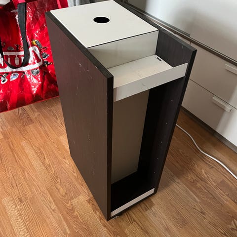 Høyskapet har 6 hyller og skapet ved siden av speilet har 3 glasshyller. Innredningen har skrumerker på venstre side, som ikke er synlig dersom oppsettet beholdes som på bildet.