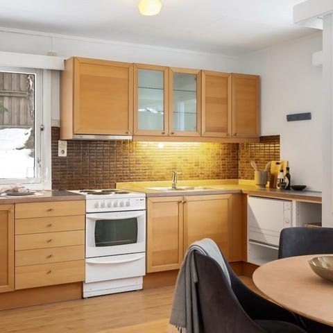 Kjøkkeninnredning i hvit utførelse med glatte fronter og overskap samt underskap. Benkeplater i heltre gir arbeidsflate på begge sider av kjøkkenet. Kjøkkenet har integrert vask med dobbel kum og armatur, plass til frittstående komfyr og oppvaskmaskin, samt kjøleskap. Oppvaskmaskin selges separat. Kjøper må demontere kjøkkenet.