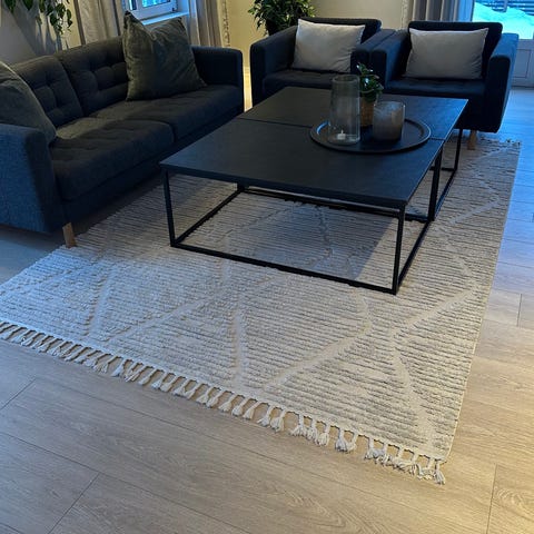 Er litt vanlig bruksmerker/mørkere der vi pleier å sitte. Er også sølt noe på enden med frynsene. Ser det ikke lett