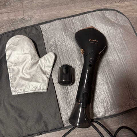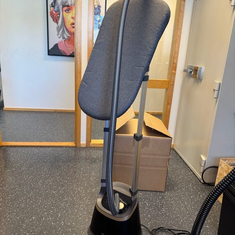 Philips 1000 Series klessteamer i blå farge. Gulvmodell med integrert oppheng og plate for klær. Leveres med hanske og ekstra tilbehørsramme som vist på bildene. Egnet for oppfriskning og steaming av ulike tekstiler som skjorter, kjoler, bukser og andre plagg som kan dampes. Strømtilkobling med ledning i bunn. Enkel konstruksjon med vannbeholder i basen og dampslange