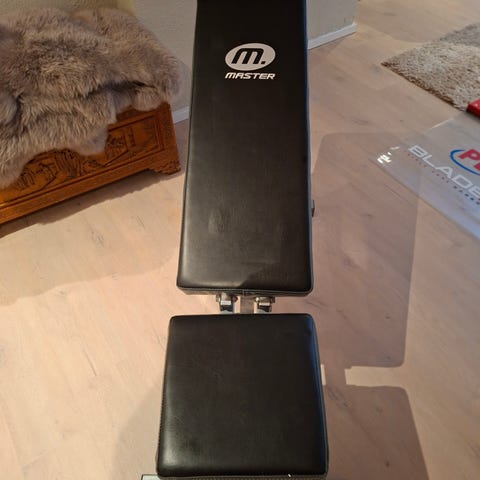 Benken har justerbar ryggdel og fast sittepute, egnet for ulike styrkeøvelser med manualer eller stang.