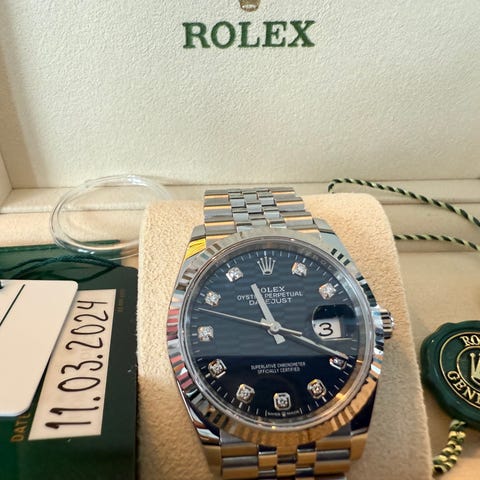 Den ettertraktede Rolex Datejust med den ikoniske blå skiven. Jubilee lenke, ny og ubrukt.
