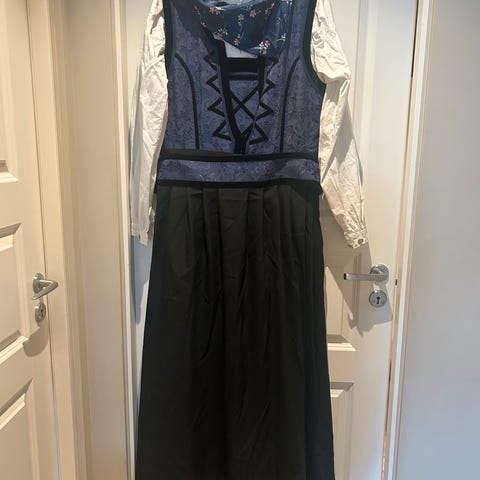 Festdrakt Åse damebunad i størrelse XS. Overdelen har lyseblå front med broderte blomsterdetaljer og mørke kantbånd. Skjørtet er mørkeblått og langt. Den er brukt to ganger og fremstår som ny, har flyttet to hemper på innsiden av beltet, men de er nå flyttet tilbake igjen.