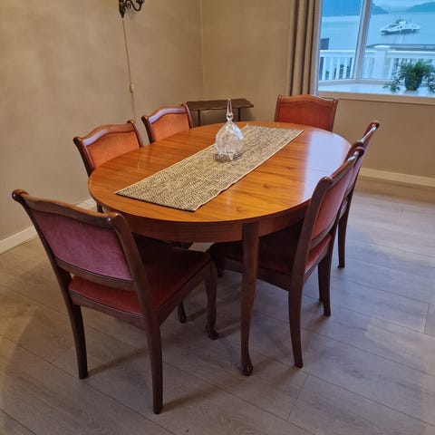 Vintage spisebord med 8 stoler – 1950/60-tall, med ileggsplater