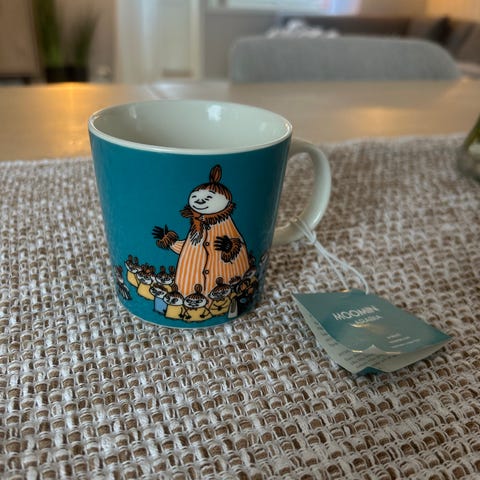 Arabia Mummi kopp i porselen med rosa bakgrunn og Mummi-motiv. Koppen har hank og klassisk Mummi-design fra Arabia-serien. Egnet til servering av varme og kalde drikker på kjøkken eller spisebord.