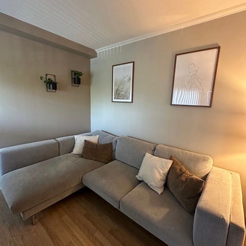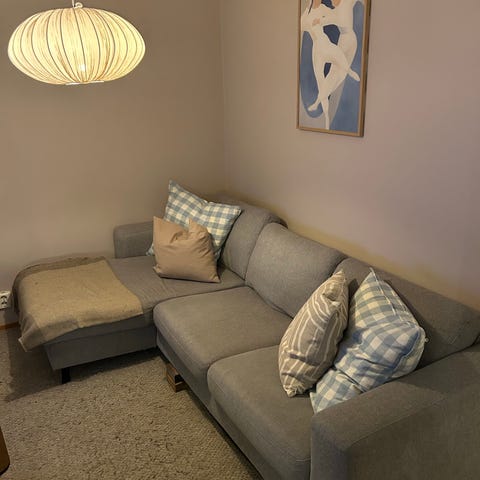 Sofa og løs puff i beige tekstil. Sofaen har rette linjer, brede armlener og lave ben. Sofaputene er lette å ta av og vaske i vaskemaskin. Puffen kan brukes som frittstående sittemøbel eller for å forlenge sitteflaten til sofa. Puffen kan åpnes og gir gode oppbevaringsmuligheter. Sofaen har ingen betydelige feil, mens puffen har en flekk. Ikke forsøkt å vaske denne med annet enn vann. Nøytral farge som passer inn i de fleste stuer. Egnet som hovedsofa eller ekstra sitteplass i stue eller TV-rom. Må hentes i 3. Etasje. Tilgang til stor heis.