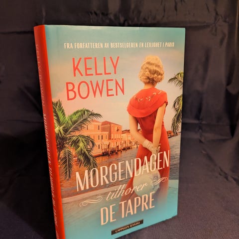 Kelly Bowen Morgendagen tilhører de tapre bok. Roman utgitt på norsk av Cappelen Damm. Innbundet. Historisk roman som følger handling fra andre verdenskrig. Boken har illustrert forside og tekst på omslaget som beskriver innhold og tematikk.