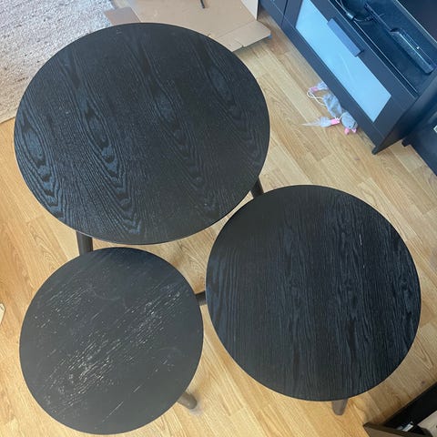 Det store er Ø: 60 cm, H: 48,5 cm og det lille er Ø: 47 cm, H: 31,5 cm. Husker ikke hvor de er kjøpt, men er kjøpt for ca ett år siden.