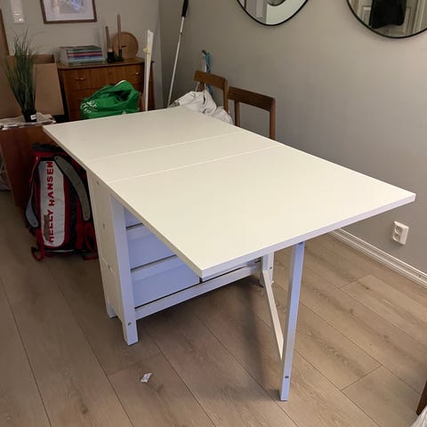 Godt brukt IKEA NORDEN klapbord. Selve bordplaten har lite til ingen merker, men kantene på skuffe seksjonen har noe skraper her og der.