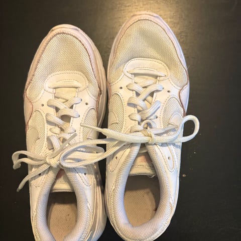 Nike joggesko i størrelse 37. Skoene er hvite med rosa detaljer, blant annet rosa Nike-logo på sidene. Overdelen har perforeringer i front for bedre ventilasjon, og skoene har snøring foran. Yttersålen er relativt tykk for ekstra demping og støtte. Passer som hverdagssko eller til lett aktivitet.