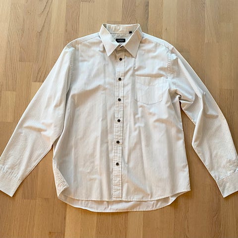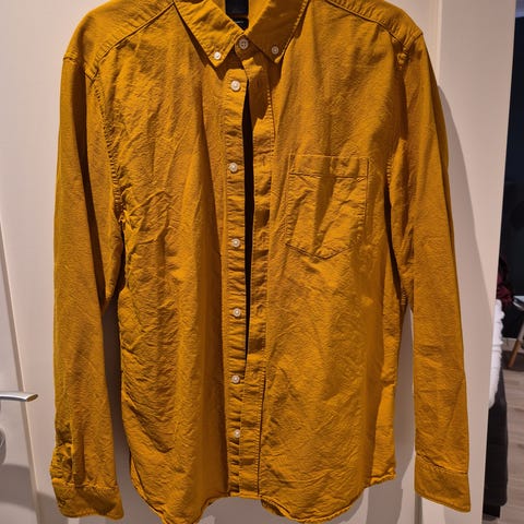 H&M skjorte for herre i størrelse L. Skjorten er laget av bomull og har brede vertikale striper i flere farger. Den har lange ermer, krage og knappelukking foran. Passer til hverdagsbruk eller mer avslappede anledninger.