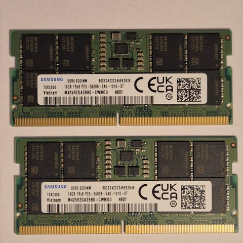 Selger 2 stk. 8GB Samsung DDR5-minnebrikker (totalt 16GB) med den raske 5600MHz-standarden. Brikkene fulgte med originalt i min laptop og er kun brukt i ca. 4 måneder før de ble byttet ut i forbindelse med oppgradering.