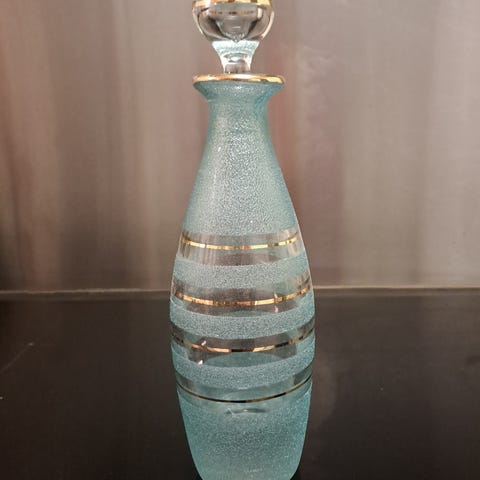Karaffelen har slipt dekor i klart og blått krystall og med tilhørende propp i glass. Egnet til servering av for eksempel brennevin, likør eller annen drikke, og kan også brukes som dekorativt innslag i interiøret. Produsert i krystallglass med tradisjonelt slipemønster. Håndlaget i Ungarn av Ajka.