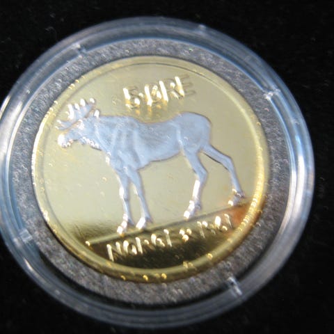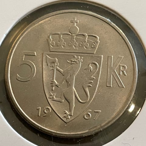 5 kr 1967 belagt med 24 karat gull og platina selges kr 175.-+porto