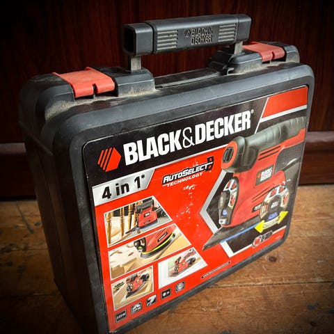 Sliperen har rektangulær slipeflate med festet slipemateriell, og er egnet til sliping av treverk og andre passende materialer.