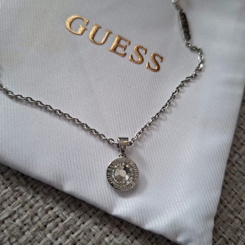 GUESS smykke for dame med sølvfarget kjede og hjerteanheng. Anhenget har dekor med klare stener på den ene siden og GUESS-logo på den andre siden. Kjedet har justerbar lengde med forlengerlenke og karabinlås, samt lite trekantformet GUESS-merke ved låsen. Passer som hverdags- og tilbehørssmykke til ulike antrekk.