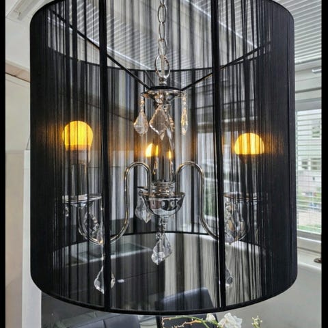 Skjermen er semi-gjennomsiktig og består av en serie tynne sorte «tråder» som gjør at krystallene skimtes imellom og lyset slipper gjennom. Metallet er «krom». Den er skikkelig fin og passer til de fleste stiler.
